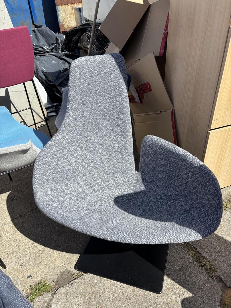 Używany fotel Moroso Fjord, niebieski, obrotowy i tapicerowany łączy w sobie nowoczesny design, komfort i unikatową formę inspirowaną naturą.