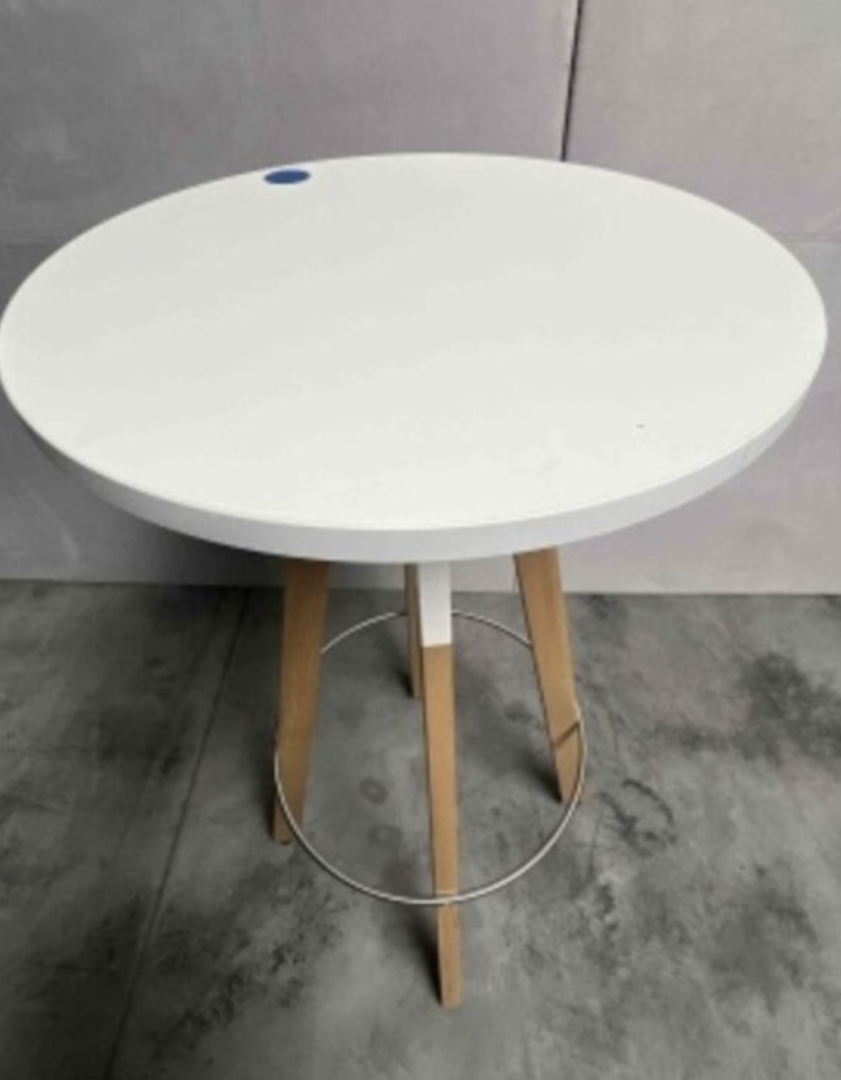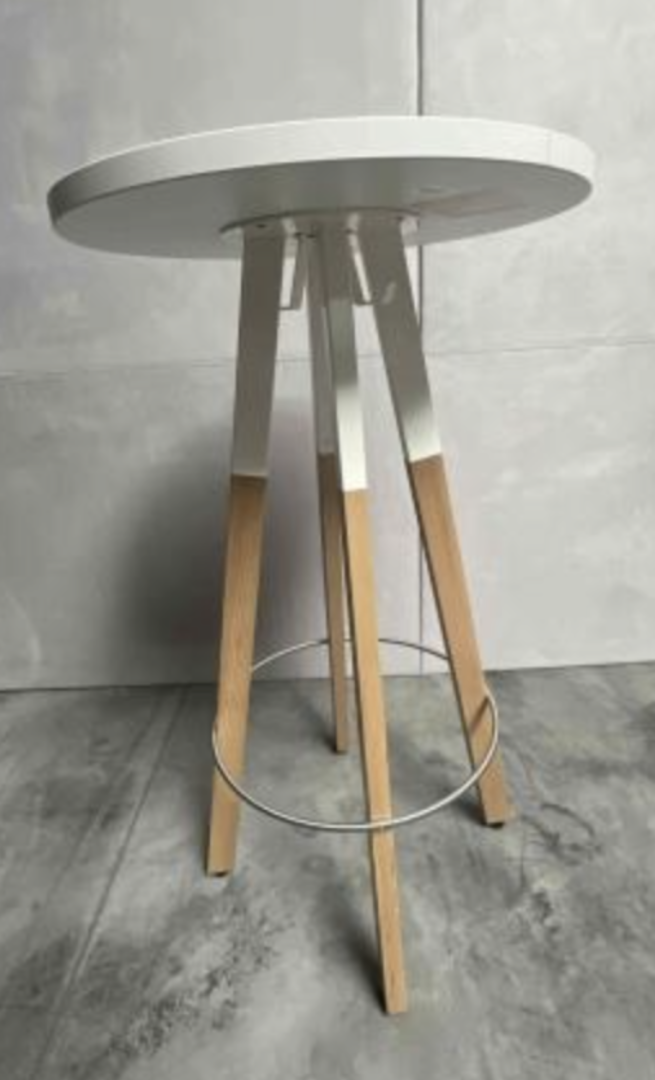 Używany stół barowy SPIN Wood Bejot biały blat, Ø 60 cm, wys. 110 cm
