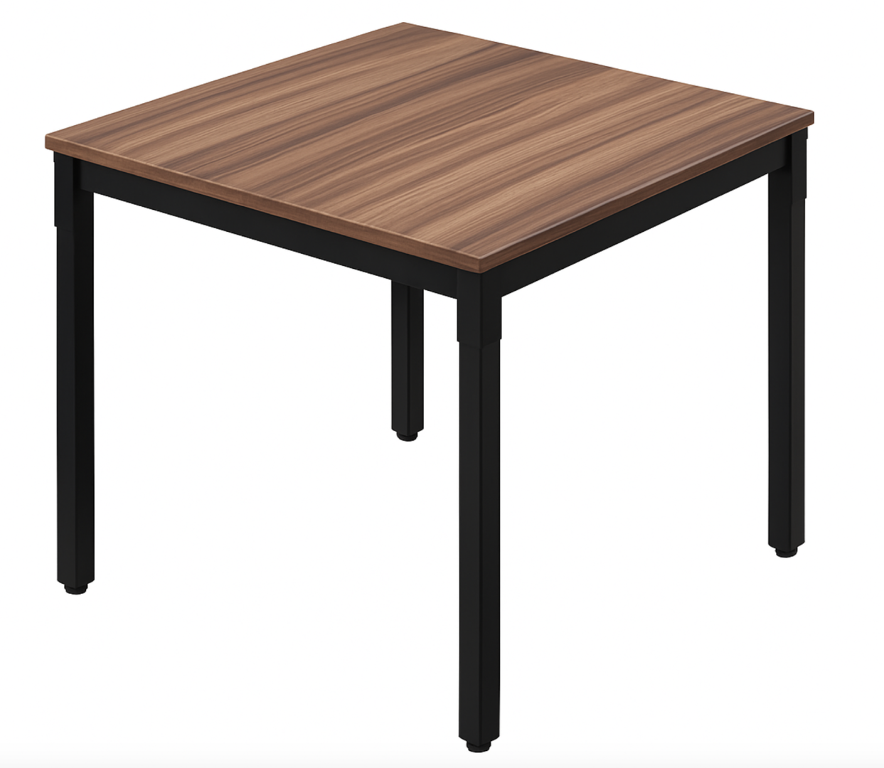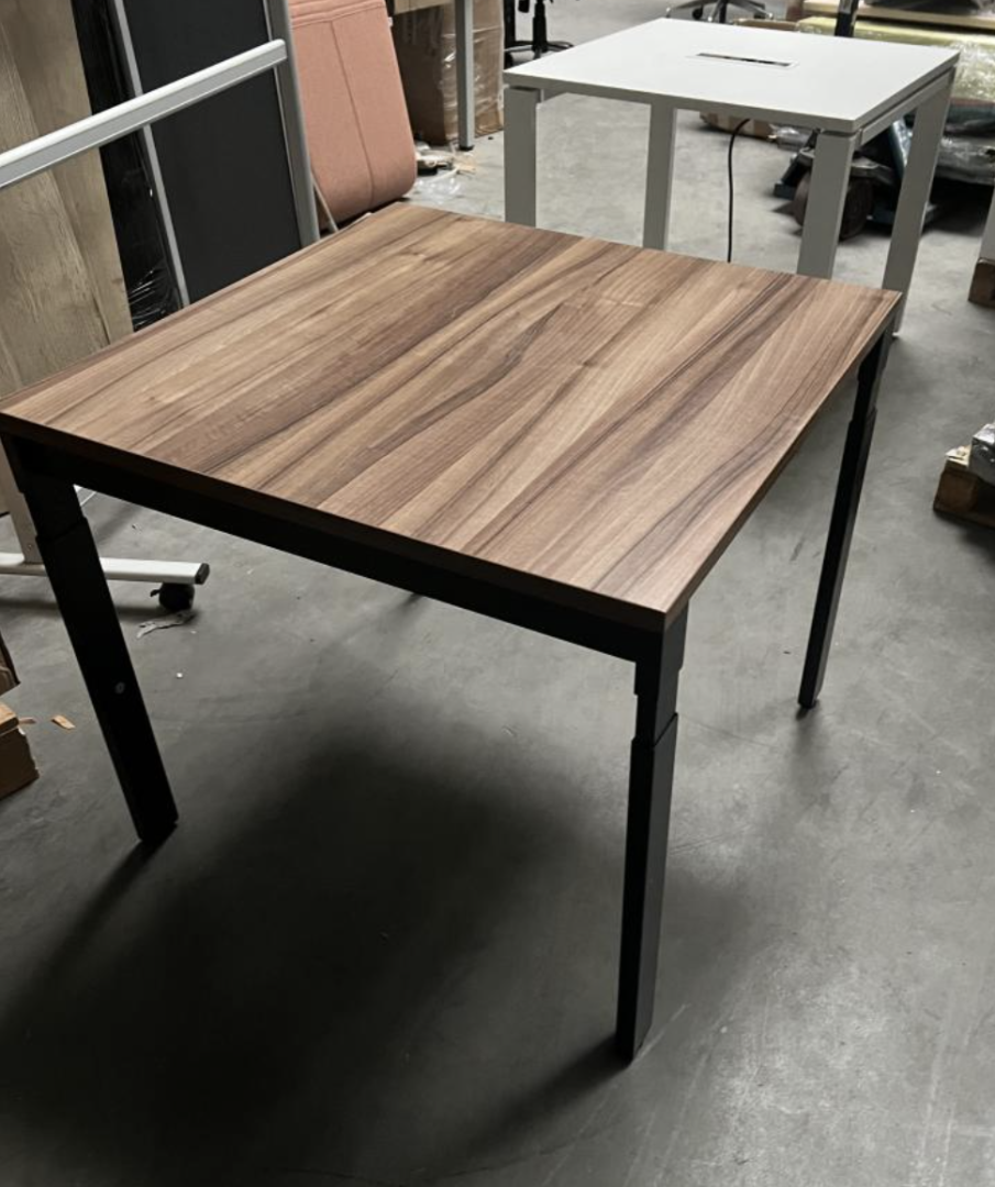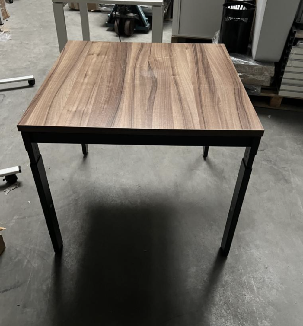 Używany stół kwadratowy 80×80 cm, blat orzech, nogi metalowe czarne to praktyczny i stylowy mebel o nowoczesnym wyglądzie, który pasuje zarówno do wnętrz domowych, jak i komercyjnych.