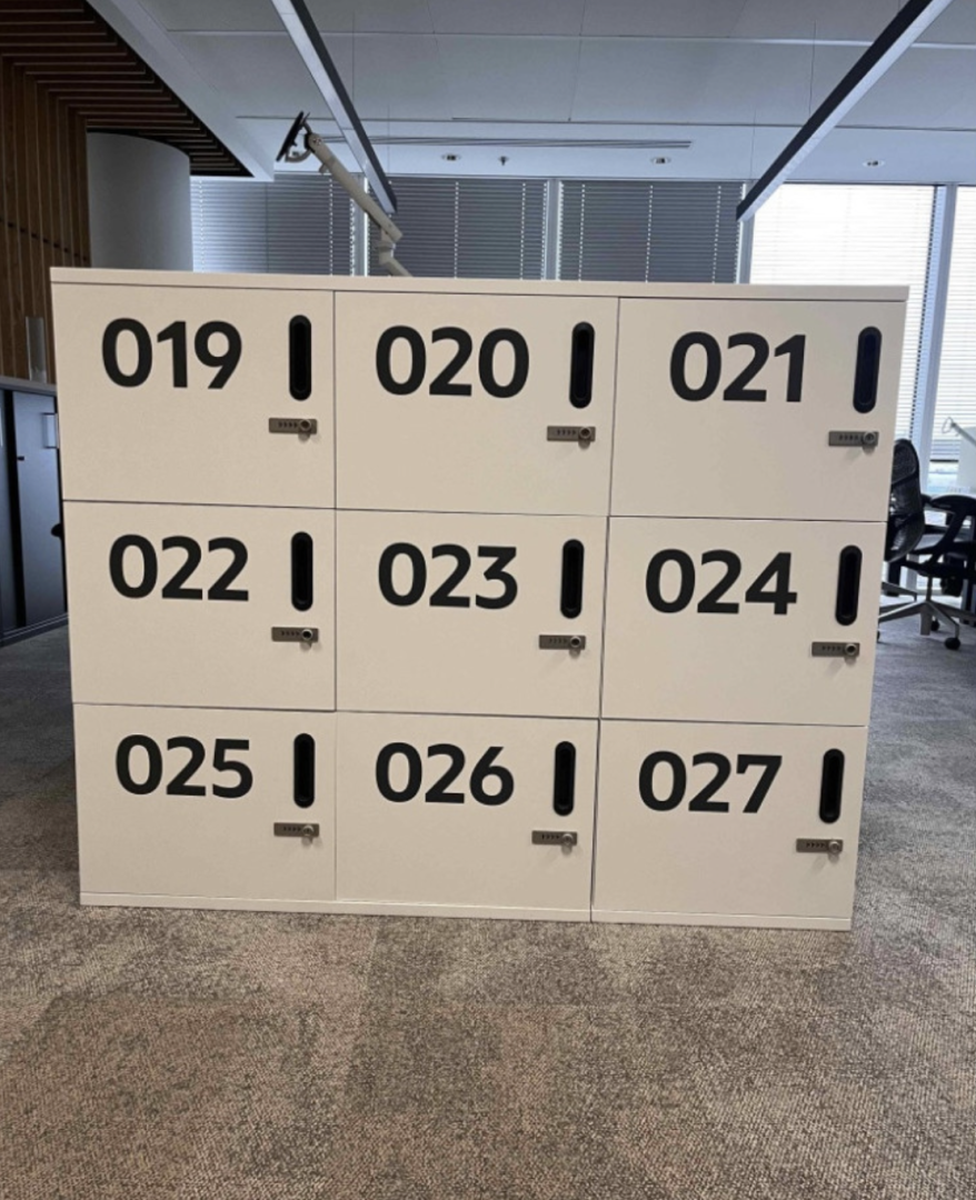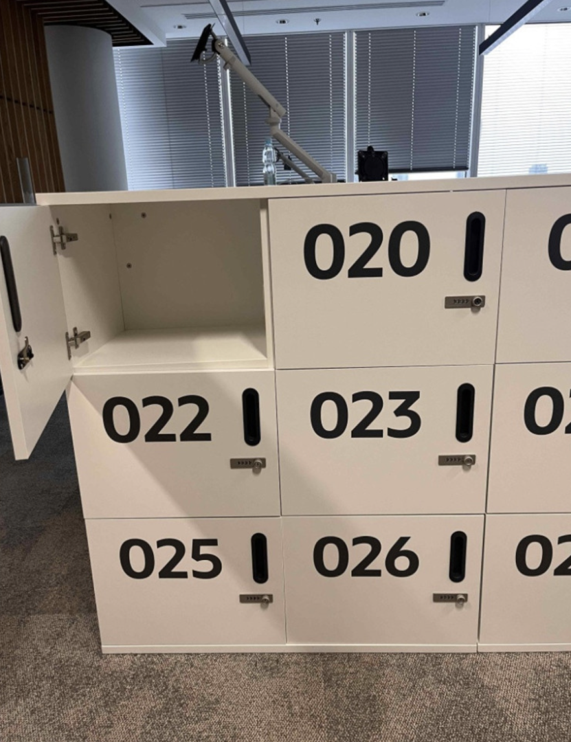 Każda szafka posiada osobne, numerowane skrytki, co ułatwia organizację i przechowywanie rzeczy w miejscu pracy.