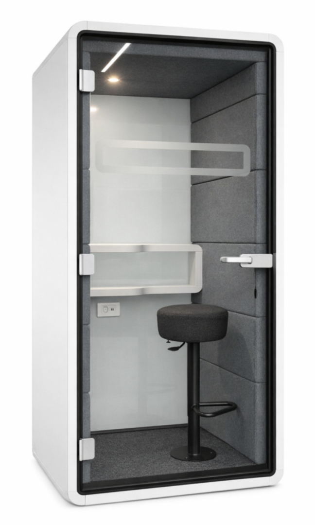 Budka akustyczna Hush to kompaktowe i designerskie rozwiązanie zapewniające komfort, ciszę i dyskrecję rozmów. Idealna do open space’ów, coworkingów czy stref publicznych, pozwala na swobodne prowadzenie rozmów telefonicznych lub pracy wymagającej koncentracji.