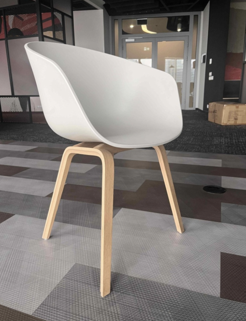 Delikatne zaokrąglenia, polipropylenowe podłokietniki oraz drewniana podstawa na czterech nogach tworzą harmonijną sylwetkę, która pasuje do różnorodnych wnętrz, zapewniając komfort i trwałość użytkowania.