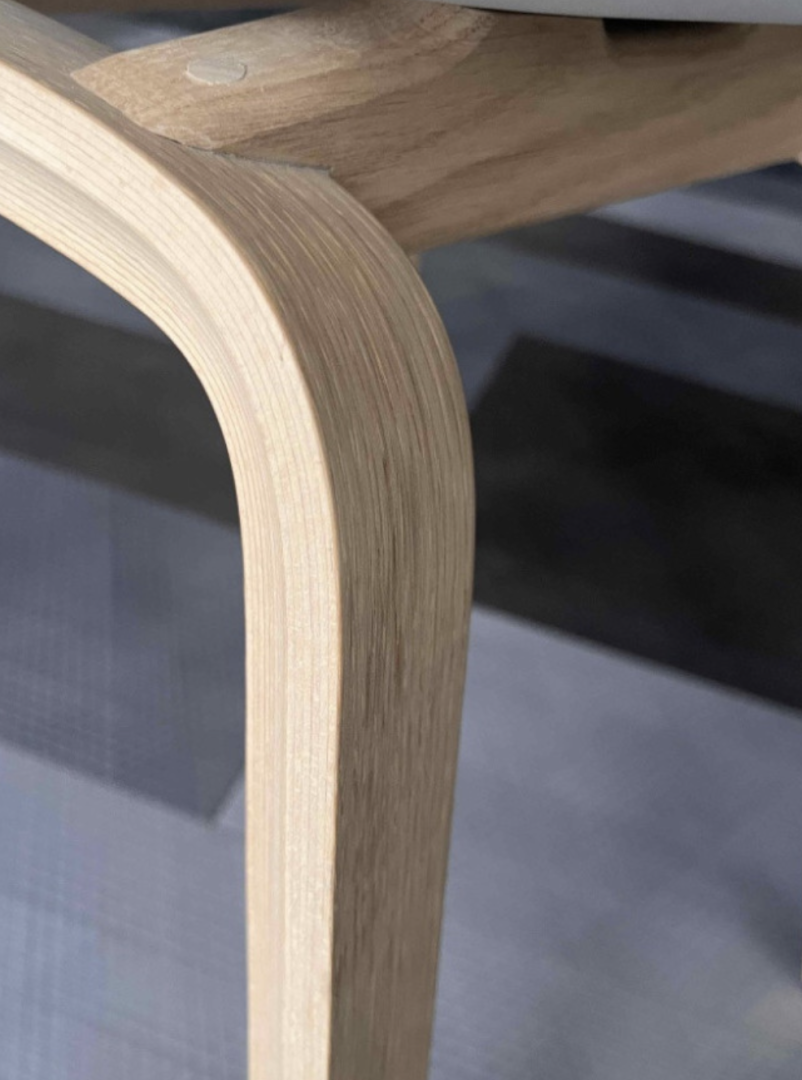 Krzesło posiada skorupę wykonaną w 100% z polipropylenu pochodzącego z recyklingu oraz klasyczne drewniane nogi, co łączy elegancję z odpowiedzialnym wyborem ekologicznym.