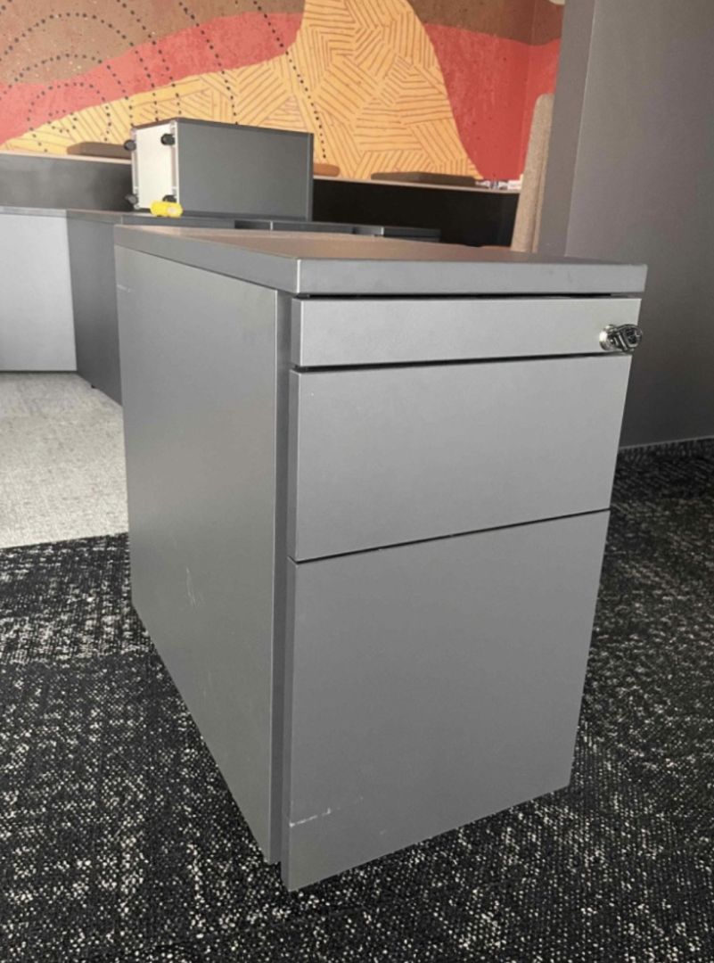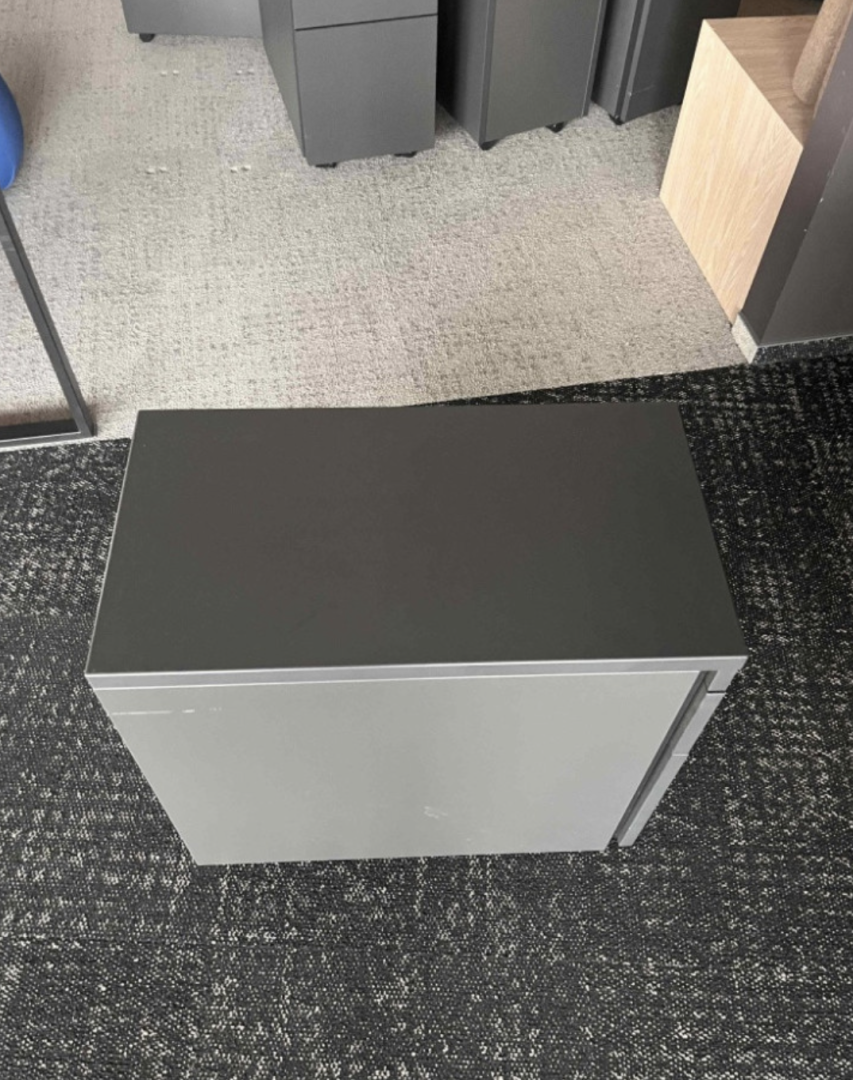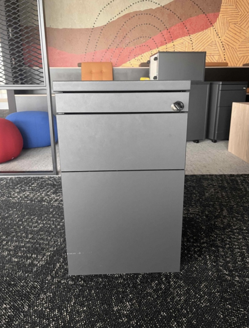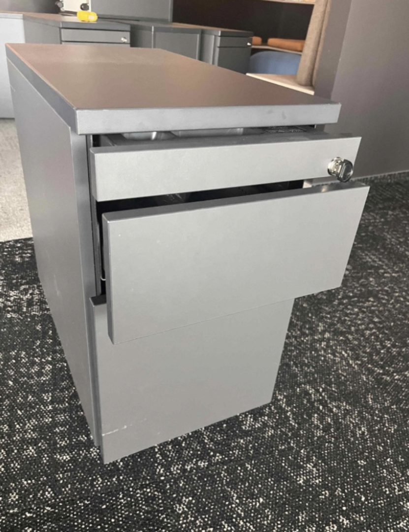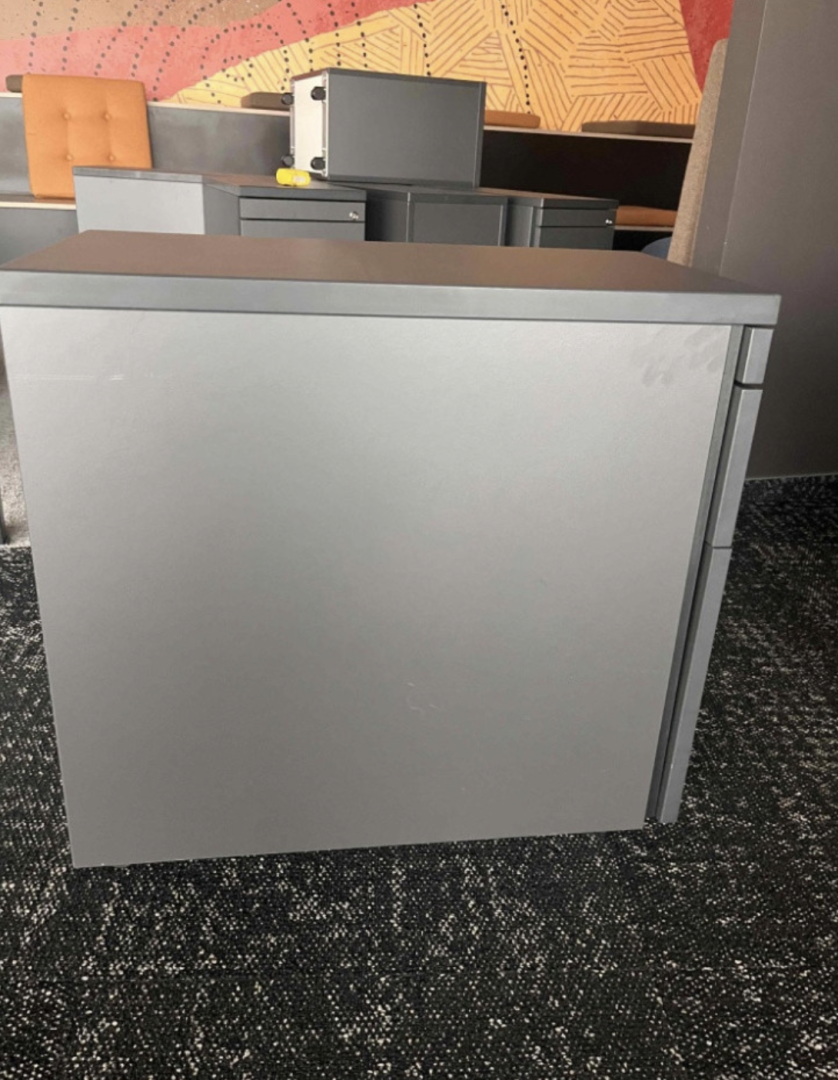 Używany szary kontenerek na czarnych kółkach to funkcjonalny, mobilny i praktyczny mebel do biura, gabinetu lub domowego workspace’u.
