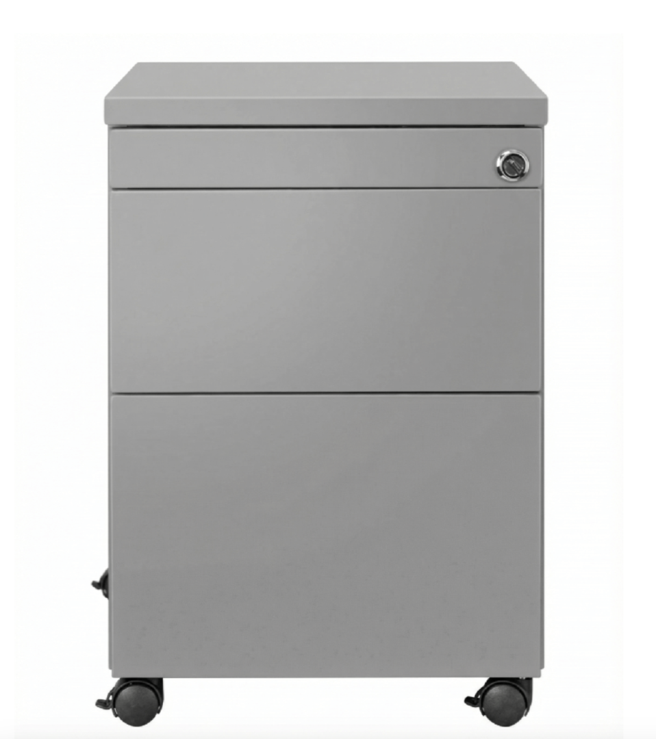 Szary kontenerek na małych czarnych kółkach to funkcjonalny mebel, który umożliwia wygodne przechowywanie dokumentów i drobnych przedmiotów.