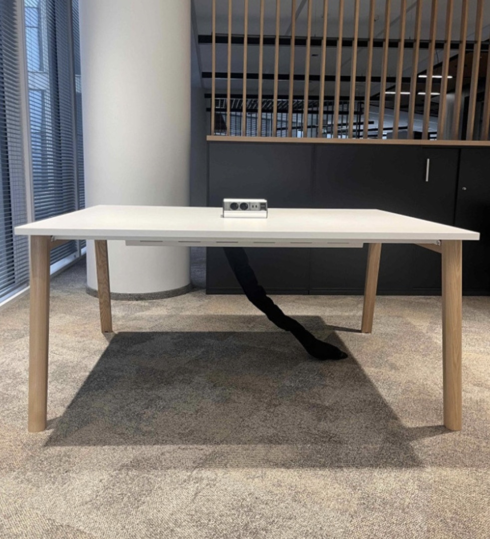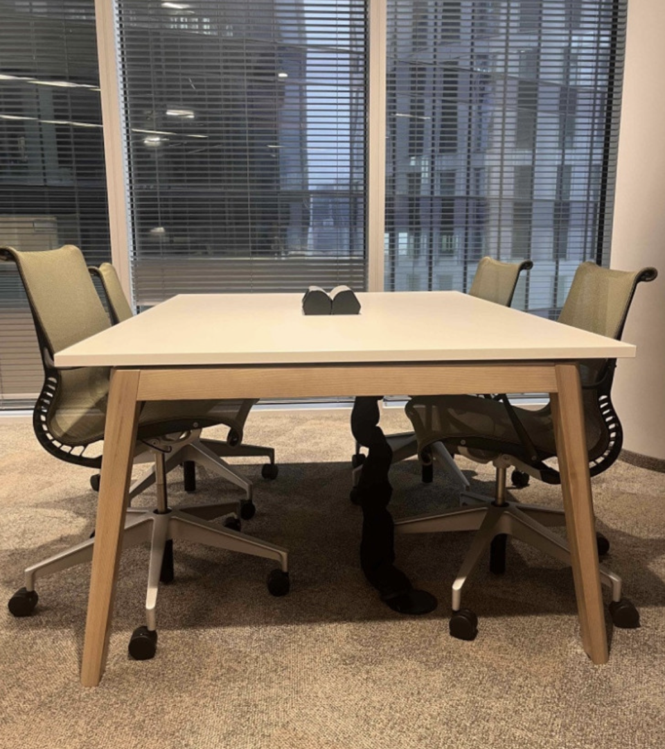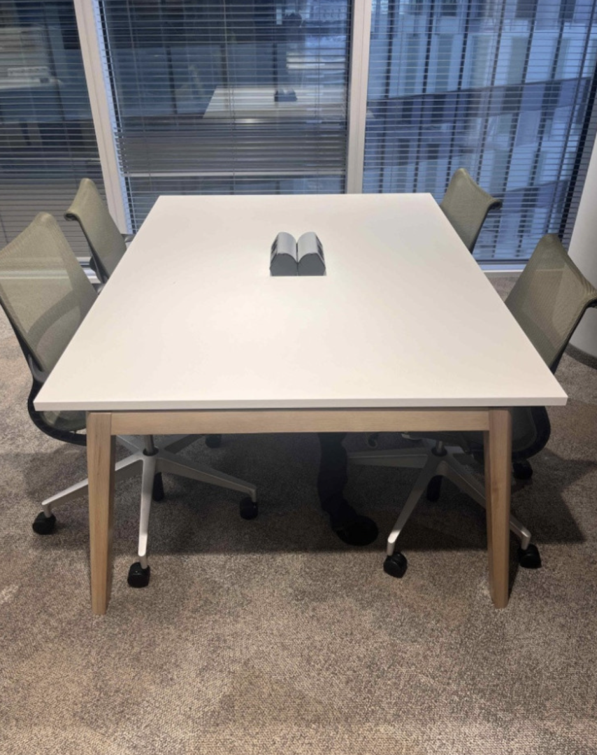 Używany stół konferencyjny biały z drewnianymi nogami to elegancki i praktyczny mebel do biura i przestrzeni komercyjnych.