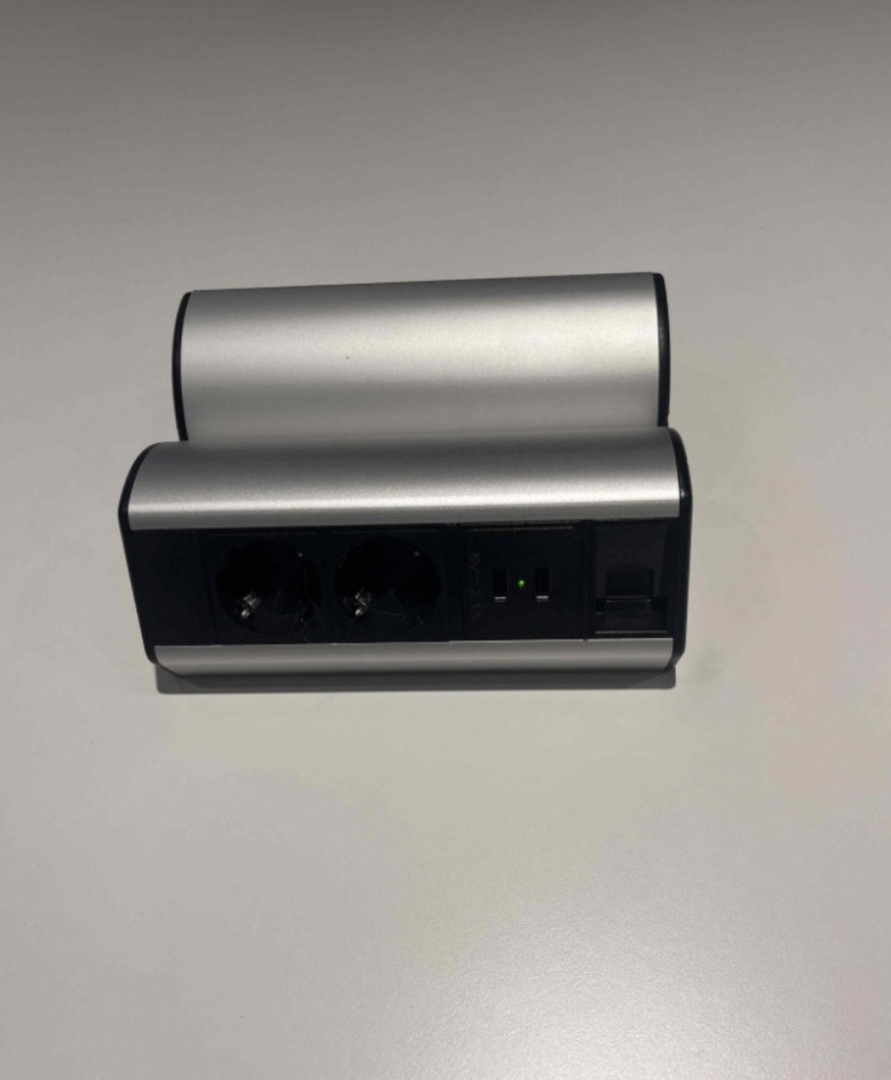 Wbudowane gniazdka umożliwiają wygodne korzystanie z urządzeń elektronicznych podczas spotkań.