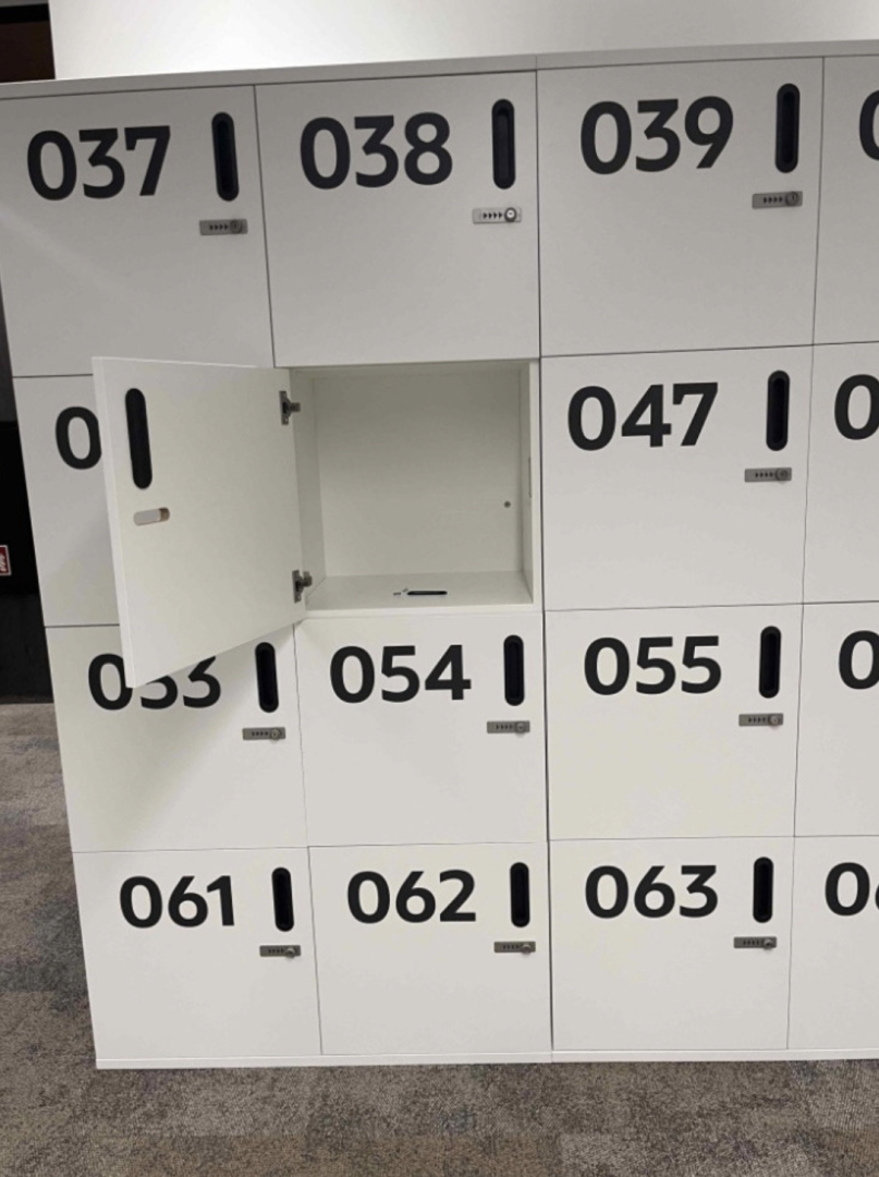 Loker posiada osobne, ponumerowane skrytki, co ułatwia organizację i przechowywanie rzeczy w miejscu pracy.